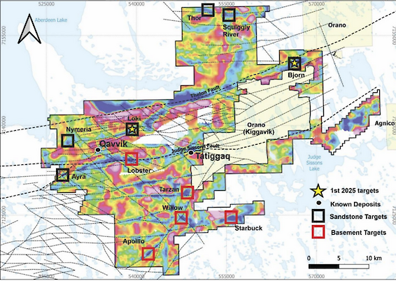 Qavvik Target Location Qavvik 2024 Drill results. Faint dots are historical Cameco drill holes QAV24-001 Cross-section 3. Ayra, 4. Loki, 5. Ned Targets Drilling identified highly elevated uranium and boron at the sandstone/basement contact in both the Ayra and Loki targets. This finding represents the first evidence of unconformity-style uranium mineralization at the sandstone/basement contact in the Thelon Basin. Elevated uranium values as high as 72.8 ppm in the sandstone and 323 ppm in the basement at shallow depths of up to 115.2m were identified. Further evaluation of these targets will be required to determine if the Ayra and Loki grids are proximal to a uranium mineralized deposit.
